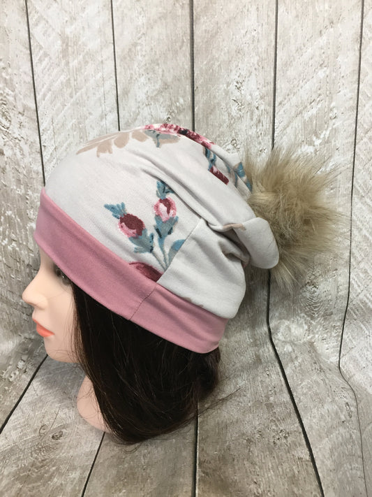 Mauve & Beige Floral Slouchy Beanie with Pom Pom